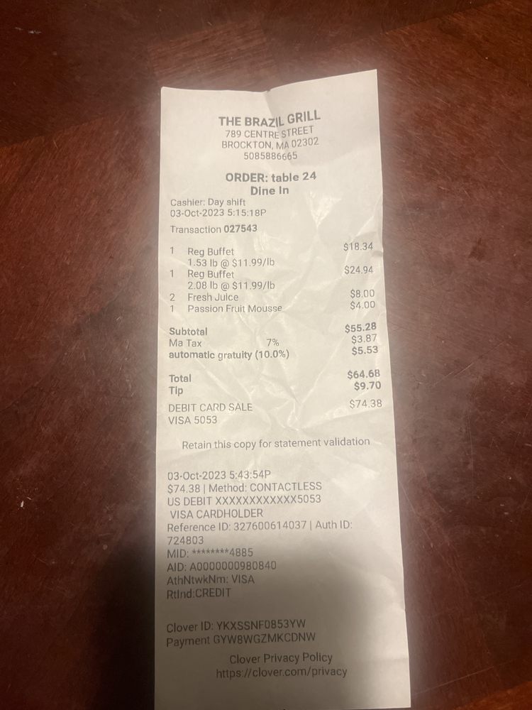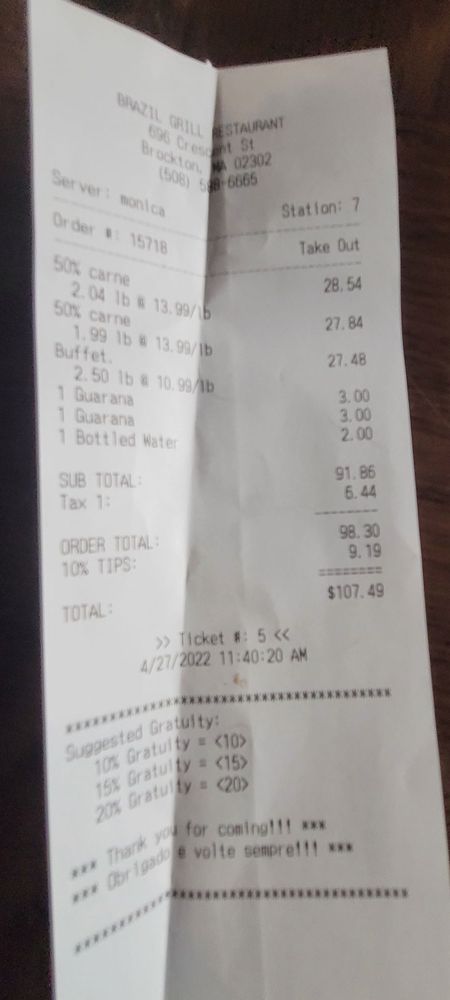 Welcome to Brazil Grill, a culinary gem located at 696 Crescent St in Brockton, MA. This vibrant Brazilian steakhouse offers a delightful buffet-style experience, focusing on rich flavors and freshly prepared dishes. Guests are greeted with friendly service in a spacious, casual atmosphere, making it ideal for groups and families. Highlighting the menu are expertly seasoned barbecued meats, including the fan-favorite beef rib, known for its juicy tenderness. The buffet also features an array of fresh salads and traditional sides, ensuring a balanced meal for every palate. Desserts like the flan tantalize with their creamy texture and delectable caramel sauce, leaving diners longing for more. Whether you prefer dine-in, takeout, or delivery, Brazil Grill caters to all, inviting you to savor the vibrant tastes of Brazil in a welcoming environment. Perfect for lunch or dinner, this is a must-visit spot for food lovers seeking something extraordinary.